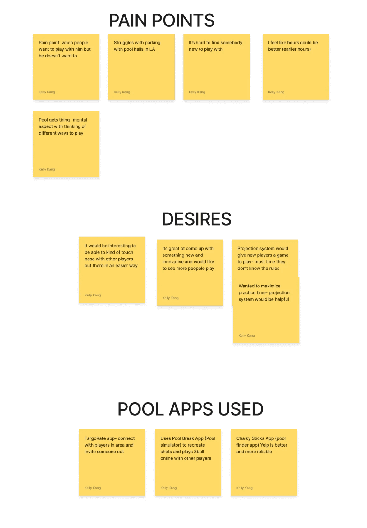 I conducted 3 interviews with other pool players to hear about their pool playing experiences, desires and pain points. Through my interviews, I gained valuable insight into my interviewees’ pain points such as waiting for a table, and disconnect of what was shown online about pool halls versus the actual experience of going there.