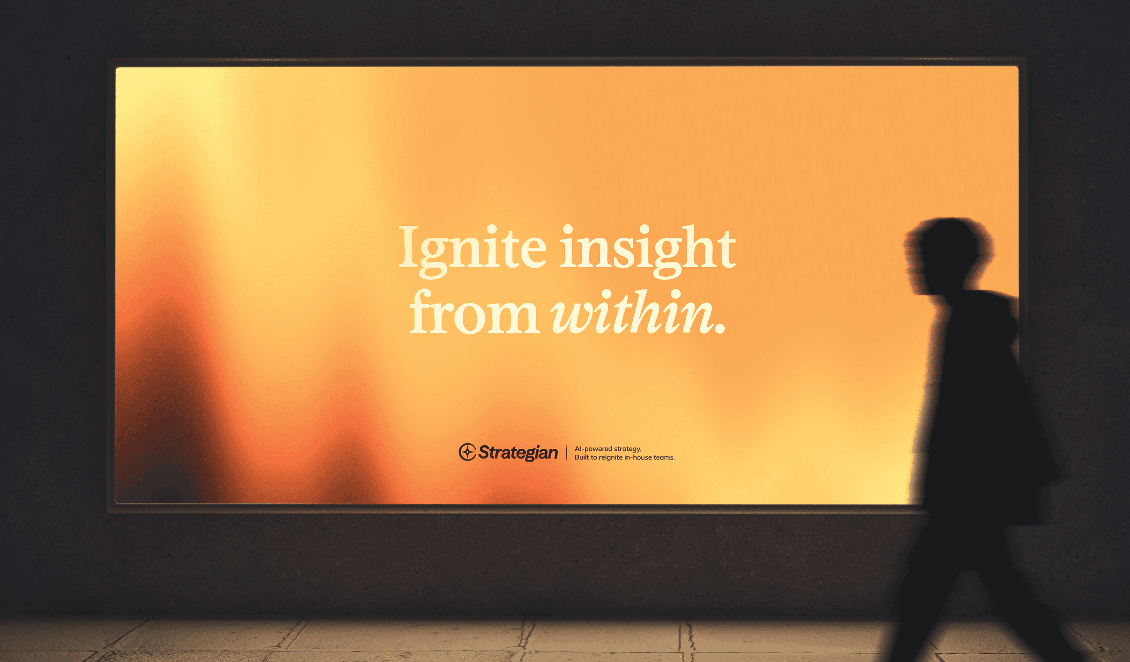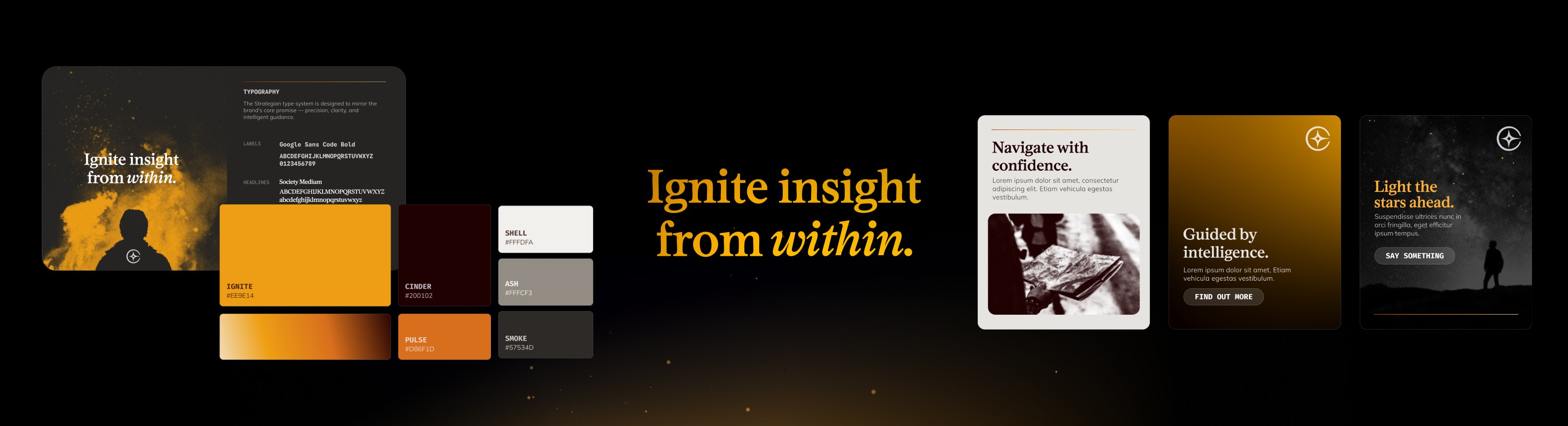 This concept leans into fire symbolism- embers, warmth, and ignition- to represent how Strategian helps in-house teams "ignite their spark" and build forward from the inside out. I paired a serif fonts, halftone navigation imagery, and minimal tech elements to create a brand that felt familiar but unique.
